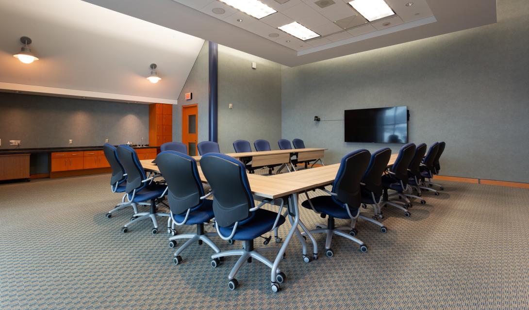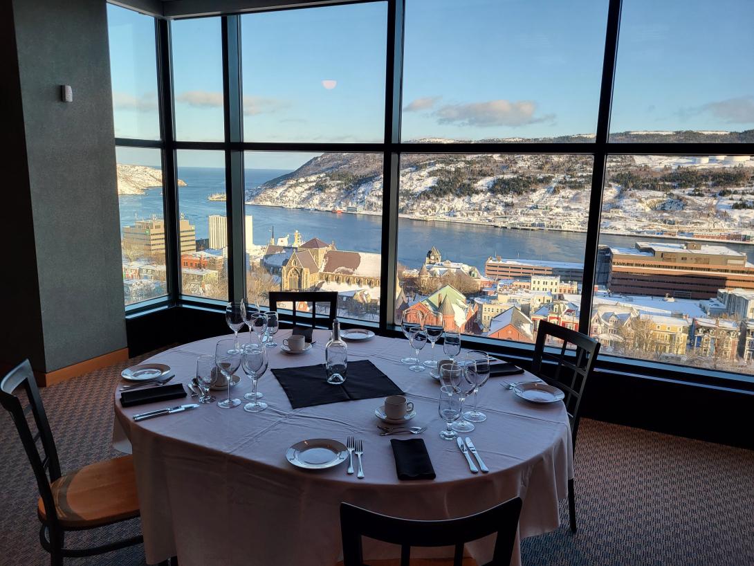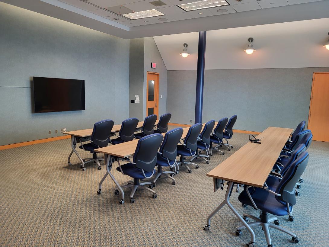 This impressive professional setting offers a stunning view of St. John’s and its harbor. This space features a 98” display, PTZ cameras, sound system, podium, in-ceiling microphones, wireless handheld and LAV microphones, and wired/wireless internet access. Suitable for presentations, web conferencing, live streaming, training sessions, etc. This room is equipped with moving tables to allow for a number of in room configurations.
